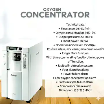 The Believia Oxygen Concentrator 7F-5BW is a reliable oxygen machine designed for daily home use. It provides a continuous supply of clean oxygen for patients with breathing problems and is easy to operate, safe, and durable.